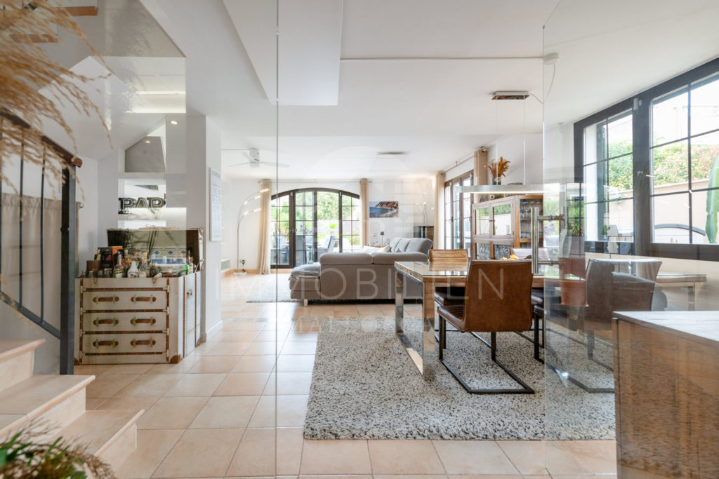 Im Erdgeschoss betritt man den Flur, davon geht der helle Wohn- und Essbereich ab, der durch den Kamin eine besonders angenehme und gemütliche Atmosphäre schafft. Von hier aus genießen Sie einen direkten Blick in den Garten sowie auf den privaten Salzwasserpool – eine perfekte Verbindung von Innen- und Außenbereich.