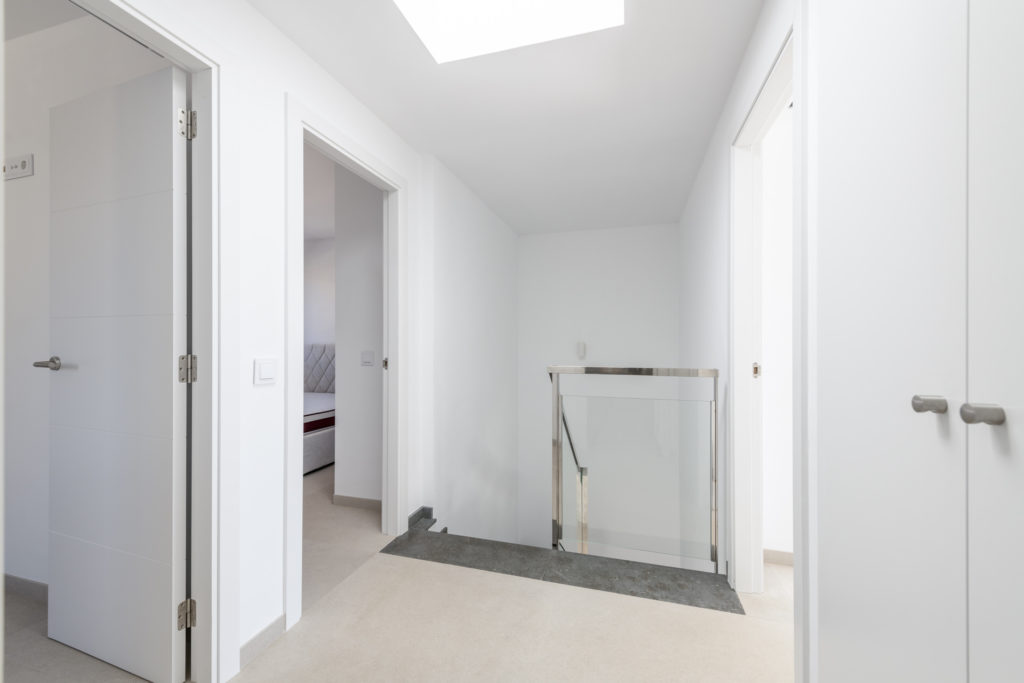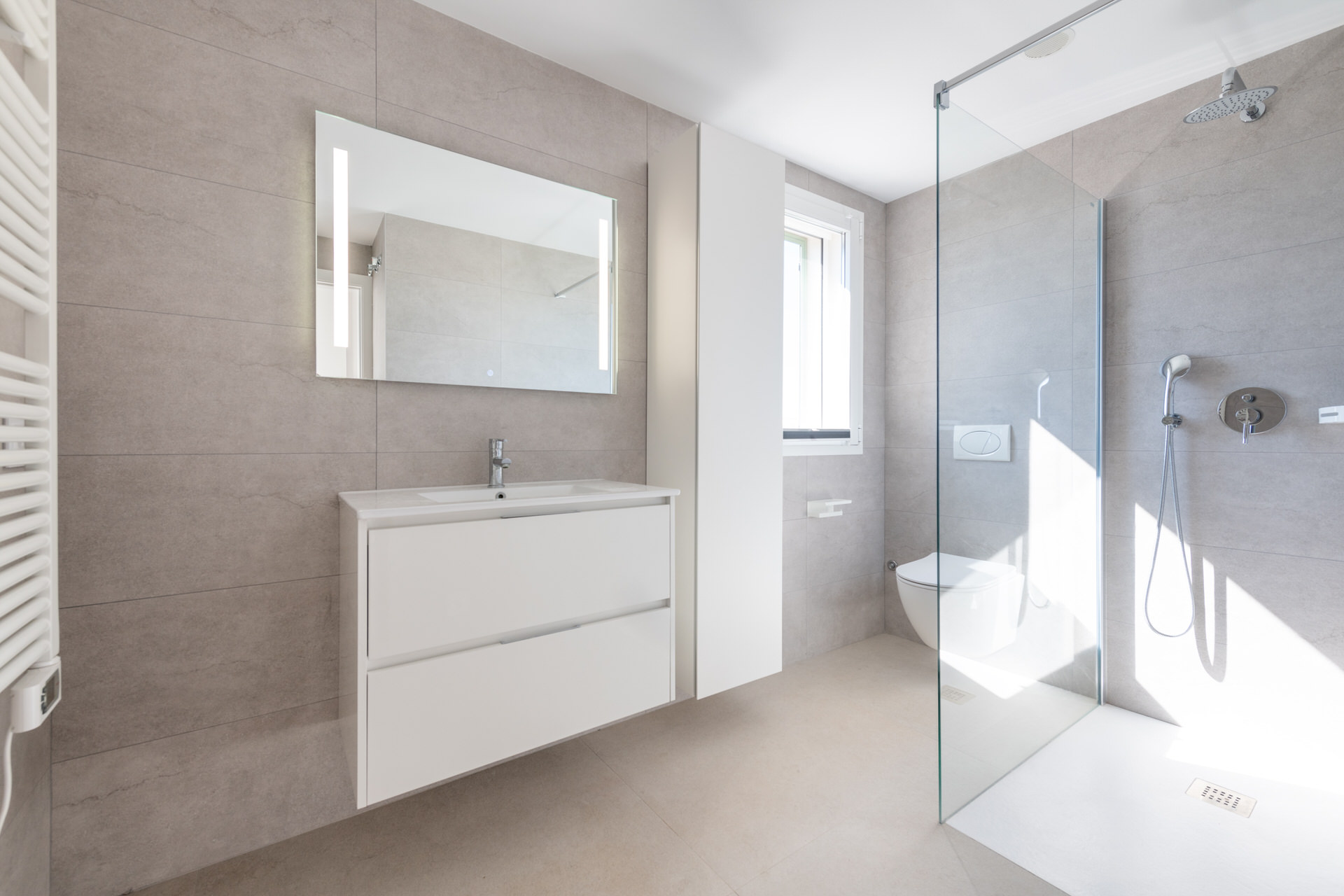 Die Immobilie verfügt über 4 Schlafzimmer (1 im Erdgeschoss, 3 im Obergeschoss). Das Hauptschlafzimmer bietet einen begehbaren Kleiderschrank sowie ein Bad en suite mit Dusche. Insgesamt stehen 3 Badezimmer zur Verfügung (1 unten mit Dusche, 2 oben – davon 1 en suite). Alle Bäder sind mit nicht einsehbaren Fenstern ausgestattet und bieten natürliche Belüftung.