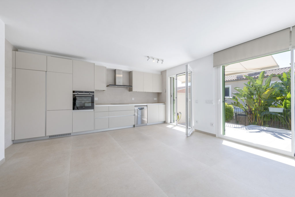 Der offene Wohn- und Essbereich mit moderner Einbauküche und hochwertigen Geräten von Siemens und Bosch bietet einen direkten Blick auf die nach Süden ausgerichtete Terrasse mit Pool – ideal für ganzjähriges mediterranes Wohnen.