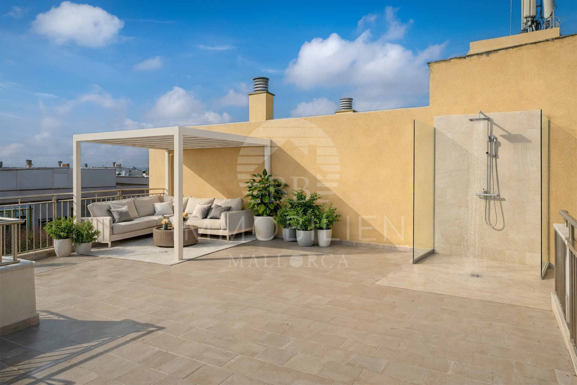 Die obere Dachterrasse verfügt über eine Außendusche sowie teilweise erweiterten Ausblick. Beide Terrassen sind mit einer Erstbepflanzung ausgestattet und bieten ganztägige Sonneneinstrahlung – ideale Voraussetzungen für Sonnenliegen, Lounge-Bereiche, Outdoor-Dining oder entspannte Abende unter freiem Himmel.